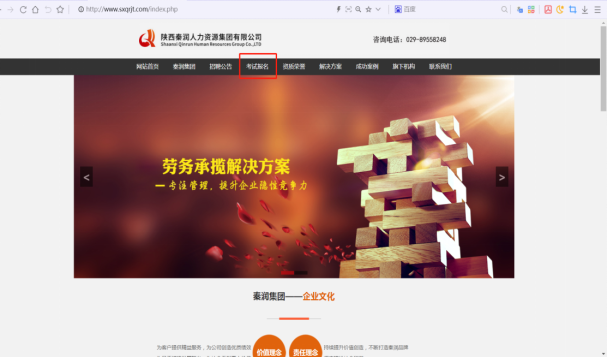 1.登錄陜西秦潤(rùn)人力資源集團(tuán)有限公司官網(wǎng)(網(wǎng)址:http://m.ecuadorsfinest.com/),點(diǎn)擊“考試報(bào)名”。